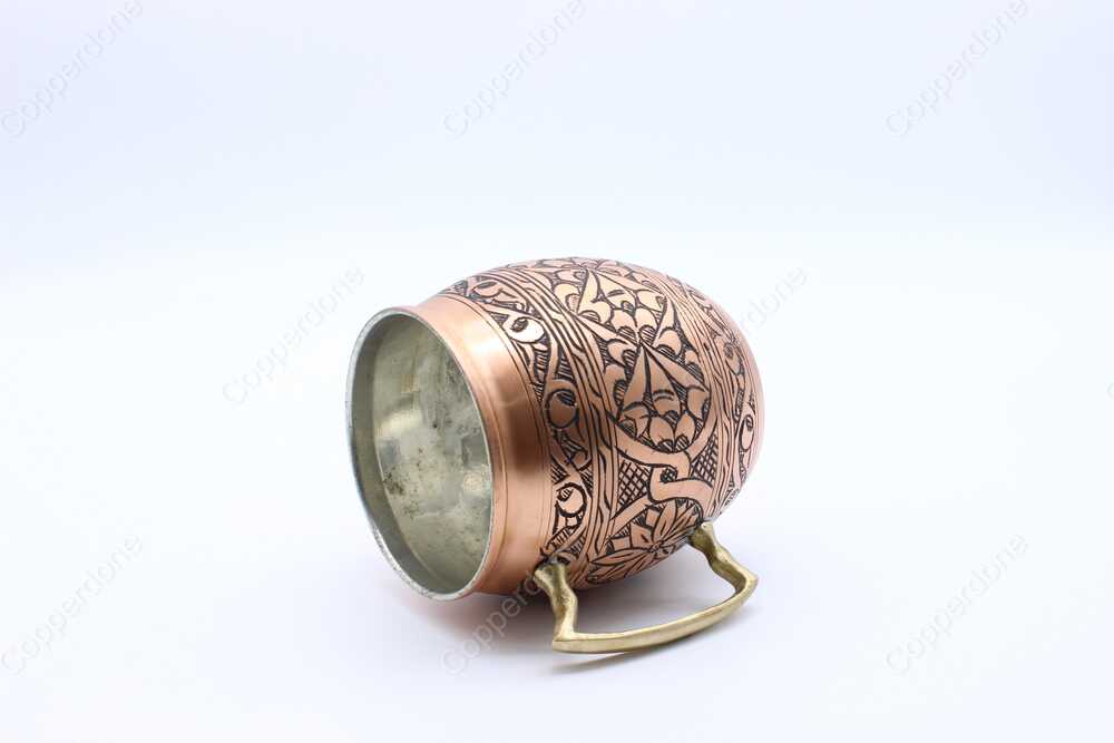 Copperdone el yapımı bakır kupa kullanım amacına göre 1-1.5 mm kalınlığında bakırdan imal edilmiş olup, ana gövdeye sabitlenmiş pirinç kulplar bulunmaktadır. Üzerlerindeki işlemeler bakır ustalarımız tarafından Gaziantep tarzı elişlemesi olarak belirtilen yöntemle tek tek işlenerek hazırlanmış ve sizlere sunulmuştur.